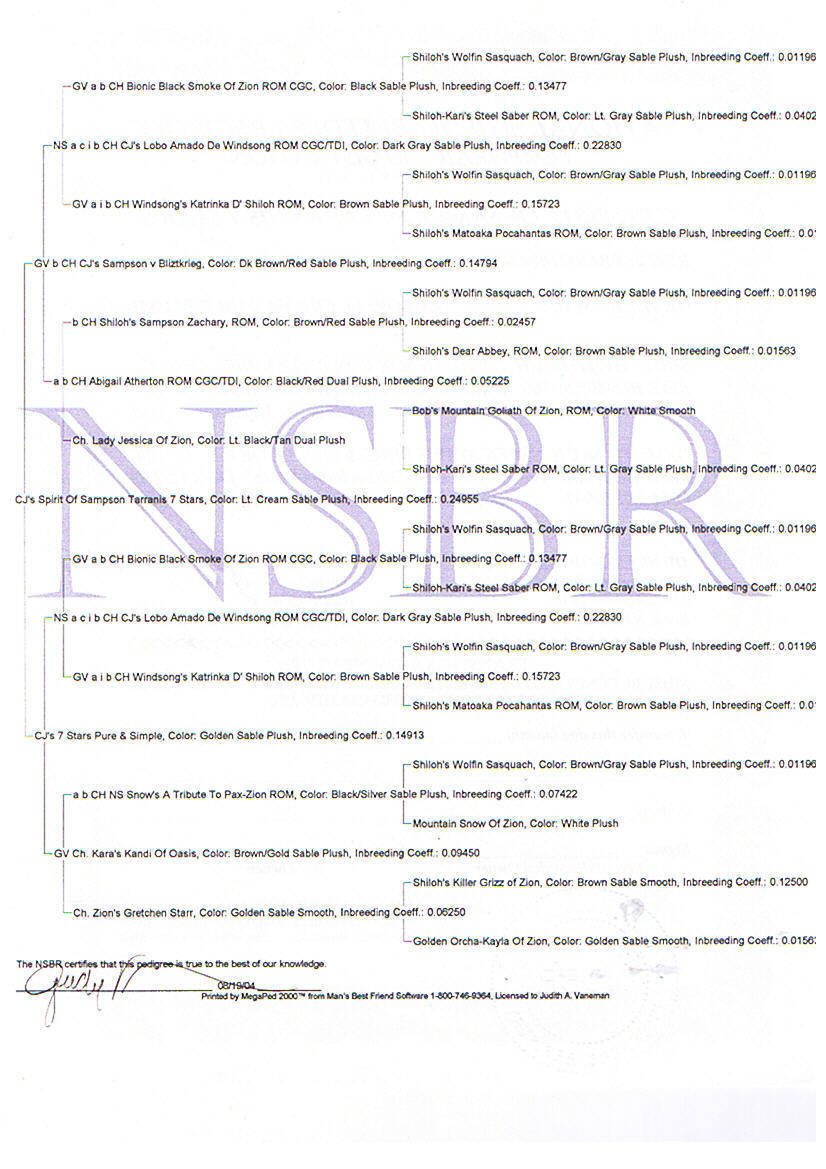 Tarran, the second male to become part of our Shiloh family comes from the highly successful Sam/Chasie breeding. Sampson, the NSBR Grand Victor for 2003 has passed on his gift for Show Ring accomplishment to his pup. Tarran attained his NKC Championship Title at the tender age of 7 months by achieving 4 Best in Show Senior Puppy Awards, as well as a Best Reserve Male in the Shiloh Specialty Show behind his Daddy "Sam". Tarran was named NSBR 2004 Top Senior Puppy and earned his NSBR Breed Championship in addition to his NKC Championship all before his 2nd birthday. Tarran has also completed his Rarities International Championship and has joined his daddy Sampson as an NKC Grand Champion. Tarran has been honored for his achievements in 2007 by being named an ISSDC National Select and by earning his 3rd NSBR Top Dog Title in 2008.